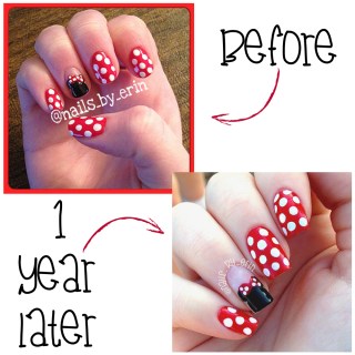 A before and after picture of my nails! The top is in April 2013 when I first did this design, and the bottom is April 2014! I think what changed the most is my nail shape and picture quality, but I am so happy to see so much improvement in my nail art in just one year.