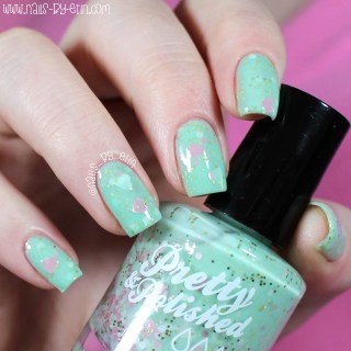 Next up is Pretty & Polished “My Best Invest-mint”. This is a mint green crelly with white circular glitter, gold micro glitter, and pink heart glitters.