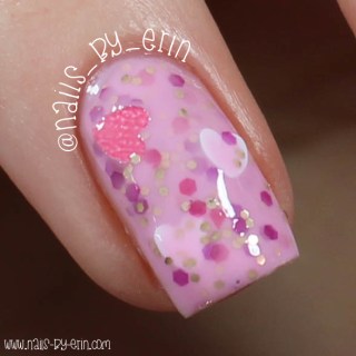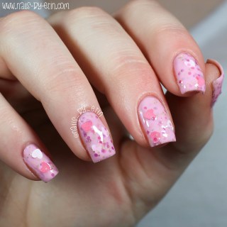 First up is Pretty & Polished “He Makes Me Blush“; a light pink crelly polish with pink, red, and silver hex glitter, as well as pink and white heart glitters! Shown is three coats with a top coat.