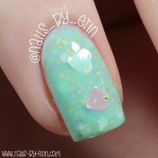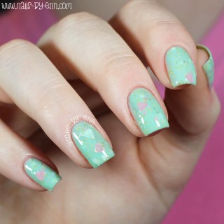 I am obsessed with the color combo for this one! Mint and pink make such a beautiful pair, and this polish is still festive for Valentine’s Day even if you’re not a fan of pink polishes. Just like “He Makes Me Blush”, the heart glitters are a bit of a trick to get on the brush, but if you shake the bottle a lot or leave it upside down like I did you can get a few on your nail.