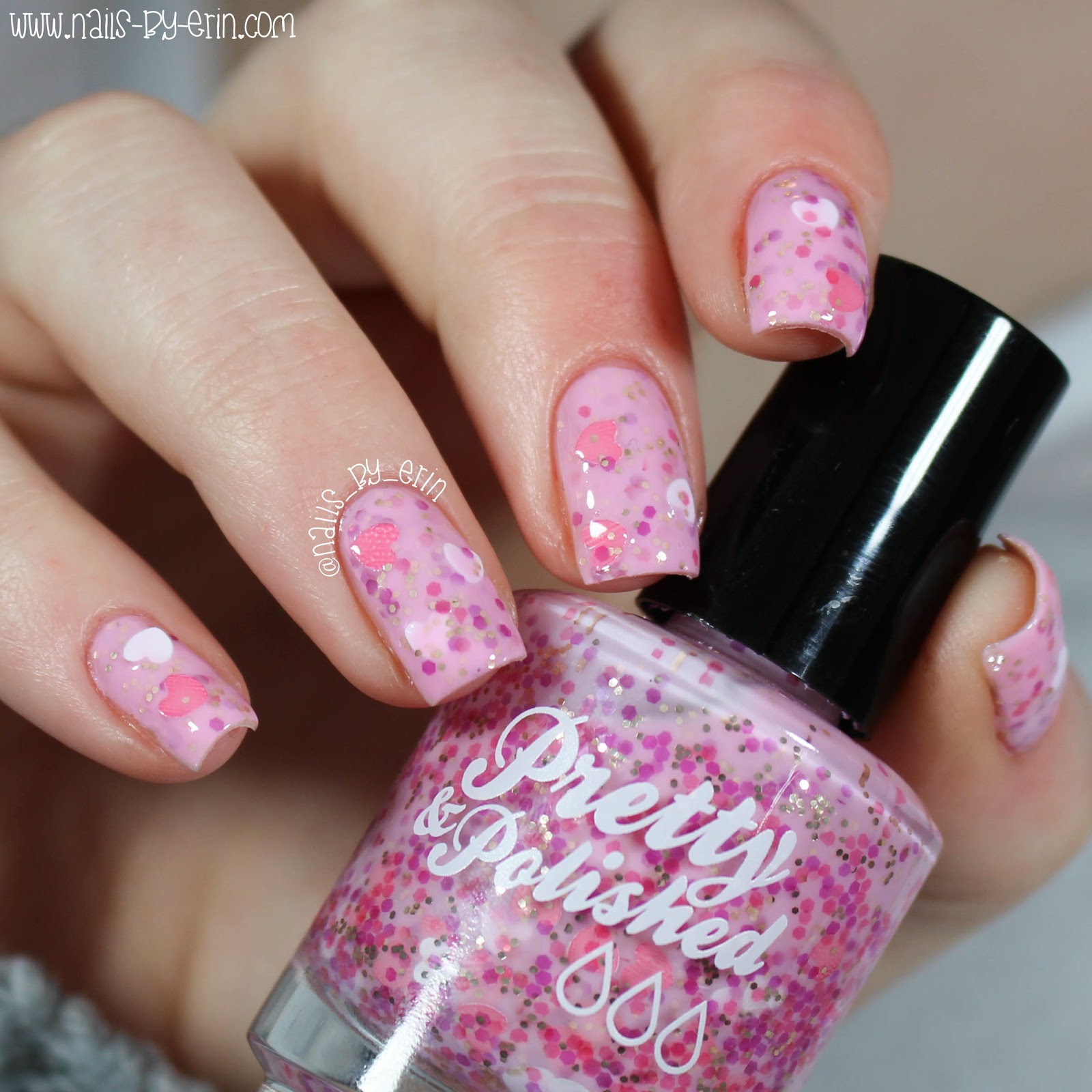 First up is Pretty & Polished “He Makes Me Blush“; a light pink crelly polish with pink, red, and silver hex glitter, as well as pink and white heart glitters! Shown is three coats with a top coat.