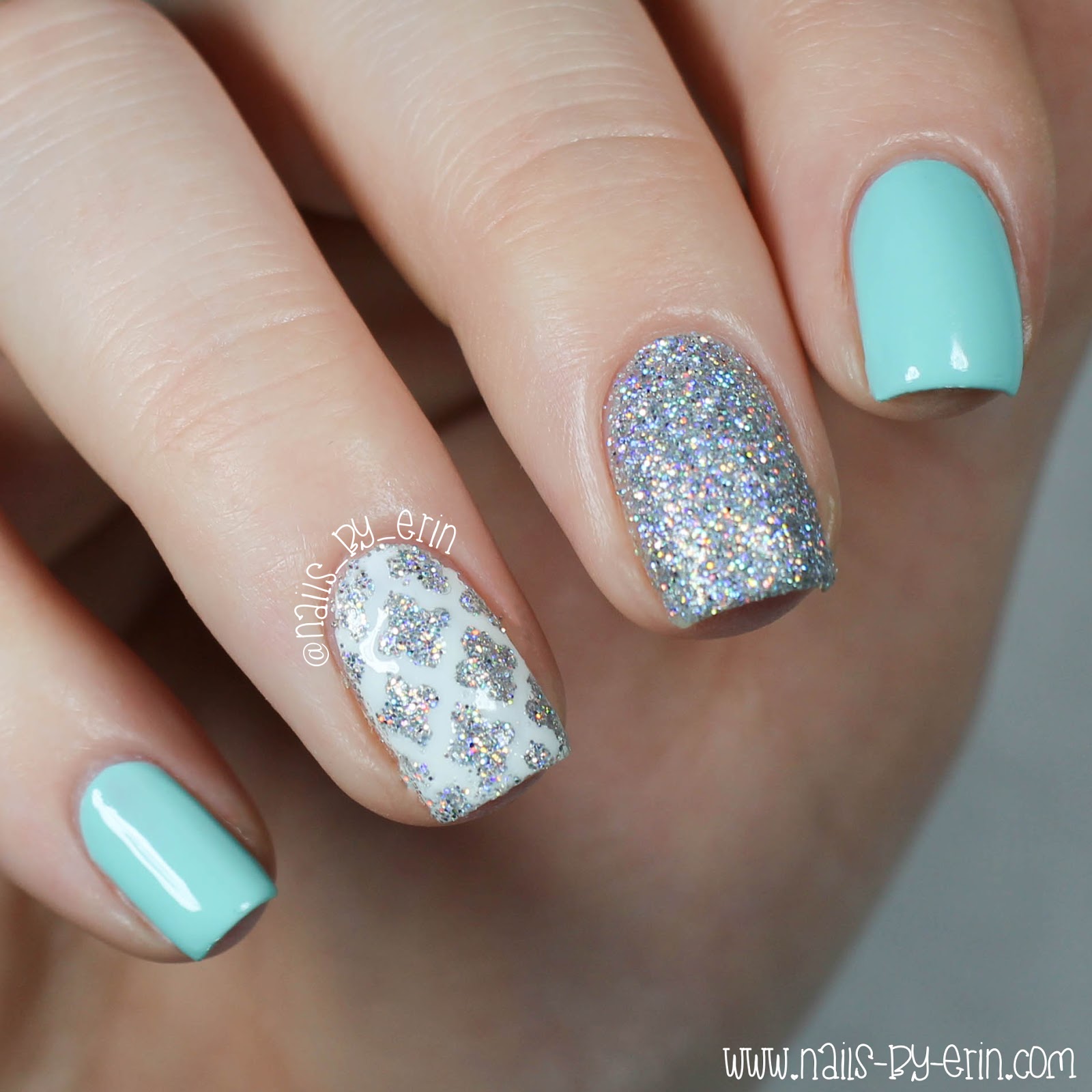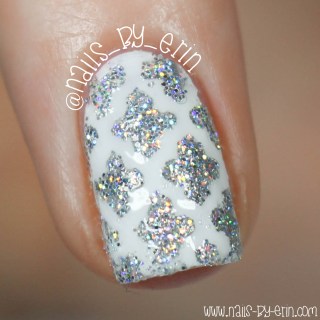 I have actually been loving the quatrefoil pattern lately, so these vinyls were perfect for me! I used my favorite glitter polish, Colores de Carol “Bling” on my accent nail and with the vinyl. Even though this glitter is nearly opaque in 3 coats, I sponged two coats on instead (using the Color4Nails Crystalline Nail Veil around my cuticle so I wouldn’t have to clean up all of that micro glitter) so I could concentrate the glitter even more.