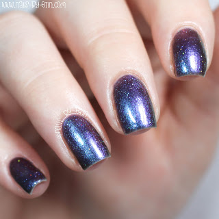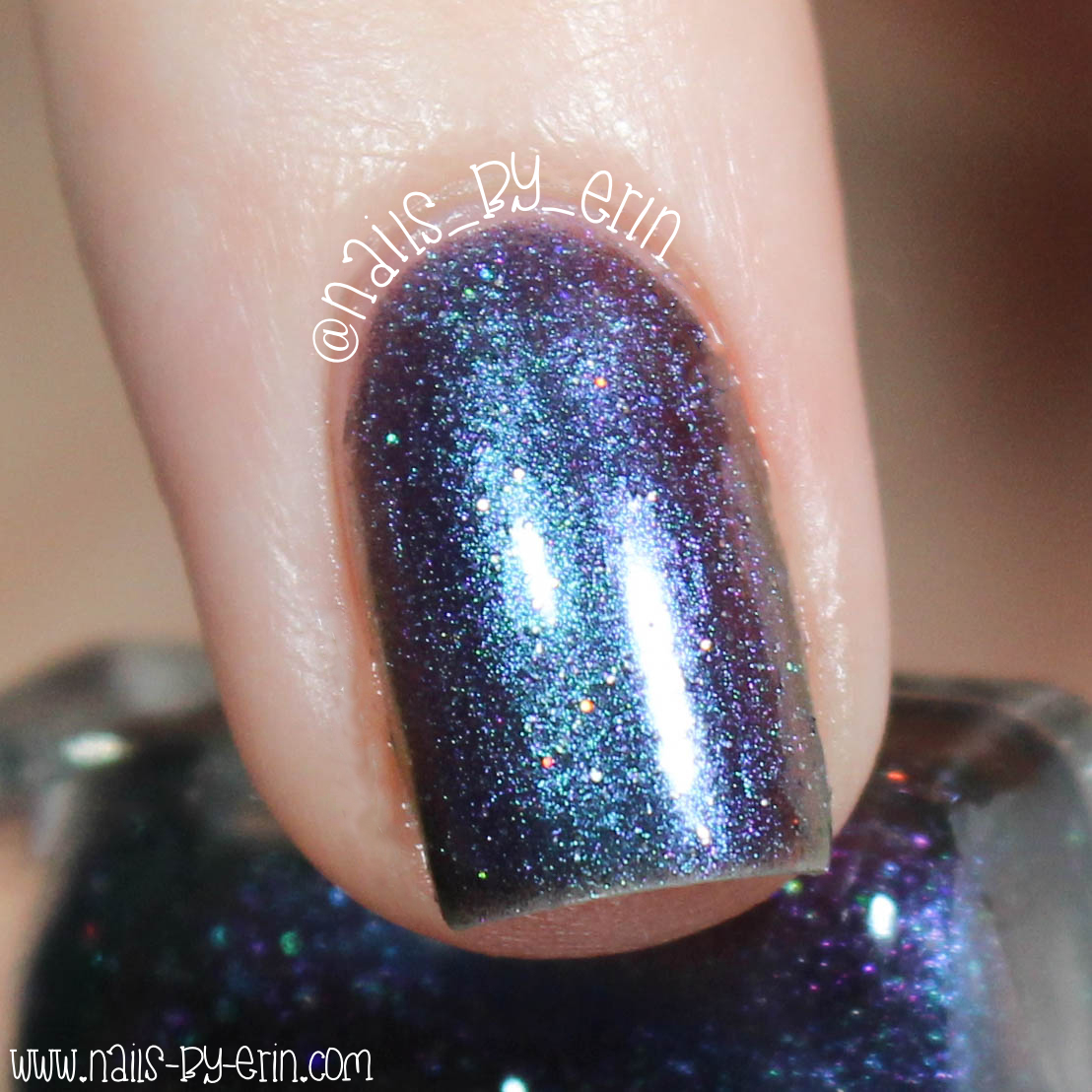 This polish is a multichrome holographic polish that also has holographic microglitter. On the nail, this polish is beautiful! It’s like a galaxy in a bottle. It mainly shifts from blue to purple but I also caught bits of red and pink depending on the lighting.