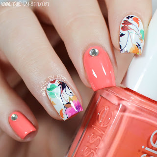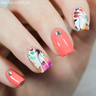 This pattern is really beautiful! It’s a mix of flowers, leaves, and vines in a bunch of different colors. Though “Tart Deco” doesn’t match perfectly with the colors in these decals, I still like how it all turned out. And of course, I couldn’t do a mani without a little bit of bling so I added one silver rhinestone to each of my orange nails. These rhinestones are also from Born Pretty Store, so if you’re interested you can purchase them here.