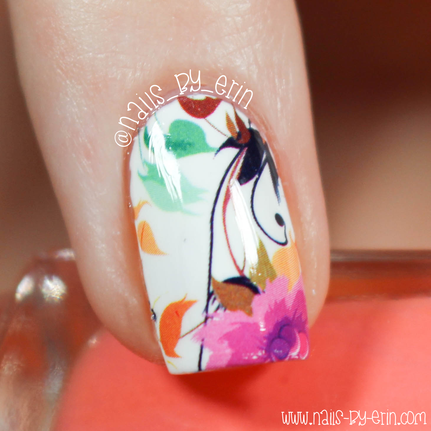 This pattern is really beautiful! It’s a mix of flowers, leaves, and vines in a bunch of different colors. Though “Tart Deco” doesn’t match perfectly with the colors in these decals, I still like how it all turned out. And of course, I couldn’t do a mani without a little bit of bling so I added one silver rhinestone to each of my orange nails. These rhinestones are also from Born Pretty Store, so if you’re interested you can purchase them here.