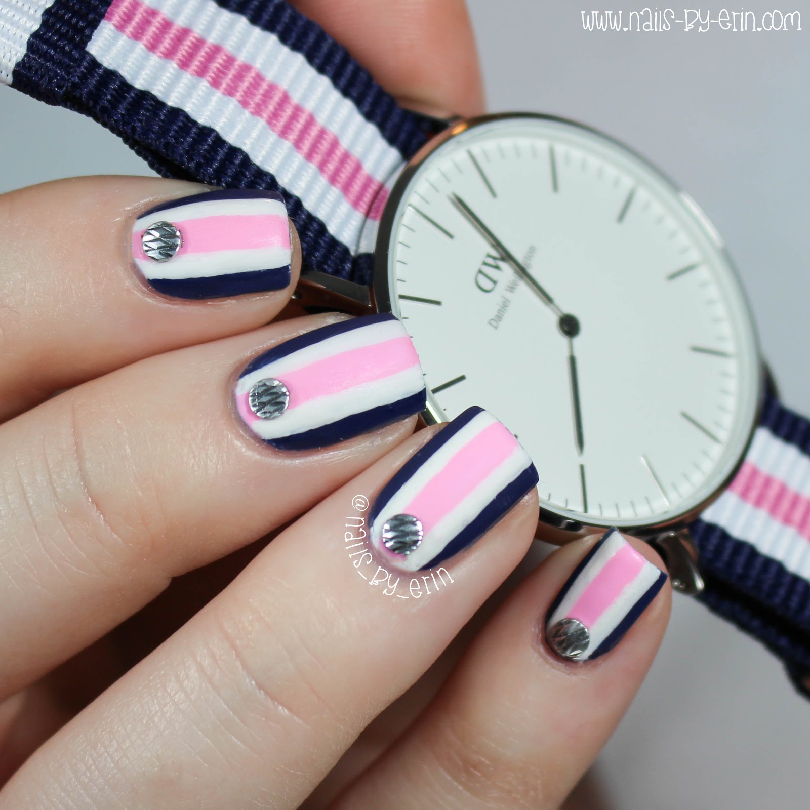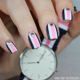 I used the same polishes as last time, OPI Infinite Shine “Get Ryd-of-thym Blues” (navy blue), Floss Gloss “Perf” (pink), and Salon Perfect “Sugar Cube” (white). The studs are from Born Pretty Store.
