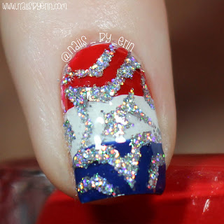 I also used some straight nail vinyls from Snail Vinyls to create the red and white stripes on my pinky, and the star stencils on my middle nail.