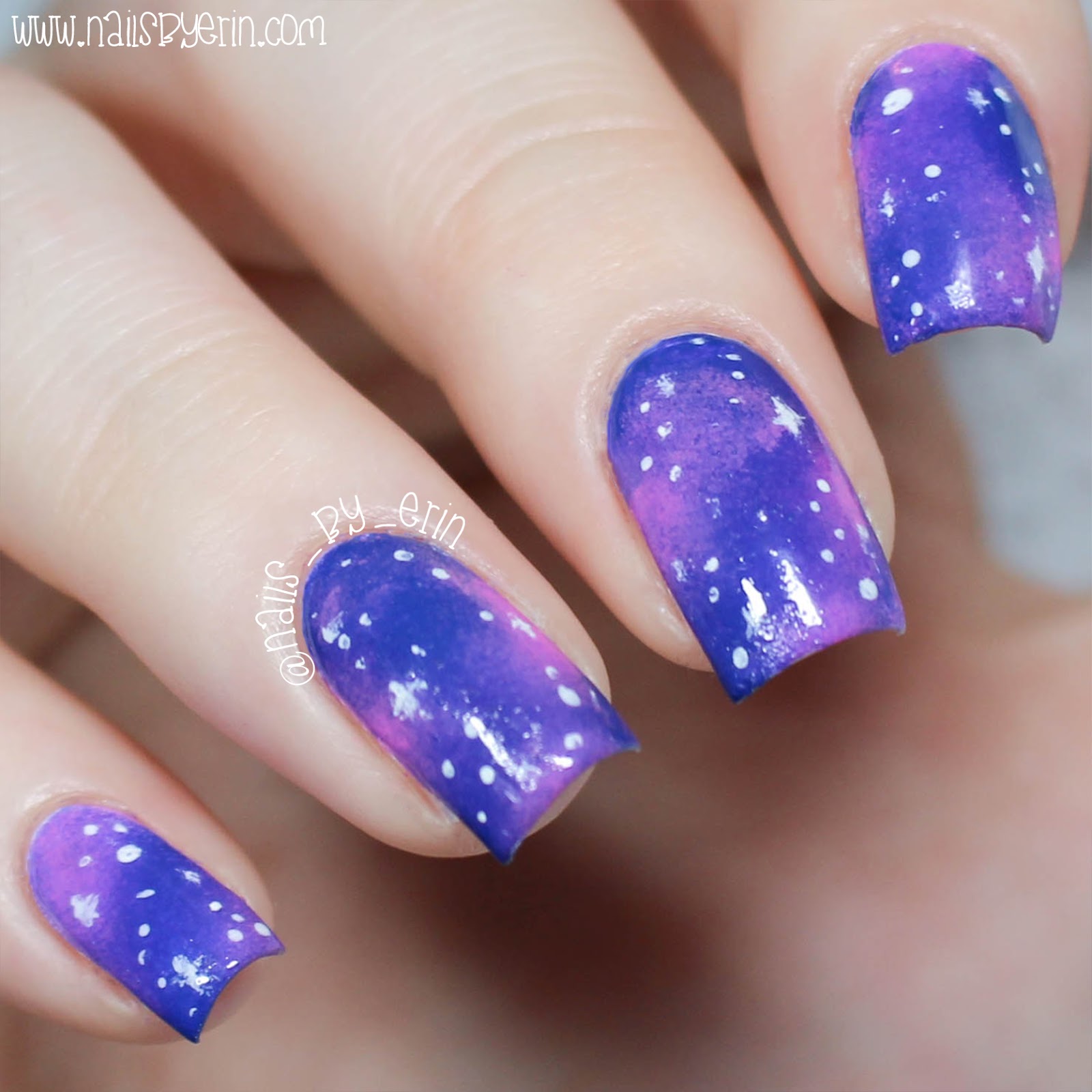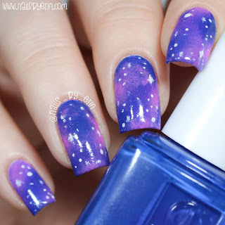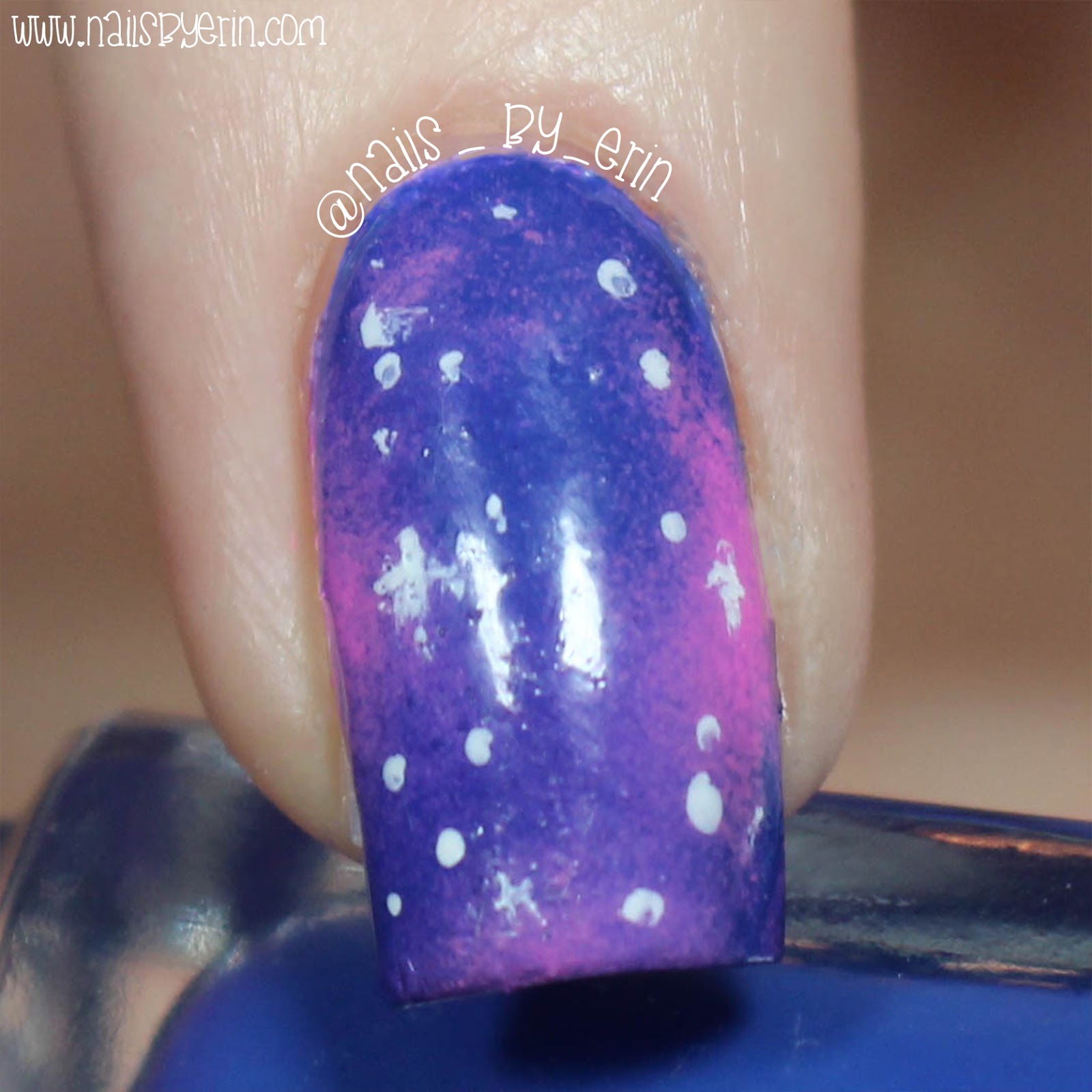I started with a white base, to make the gradient pop. Then I used Essie “All the Wave”, Salon Perfect “A Royal Affair”, and Color Club “Peppermint Twist” to do the gradient to look like the space background. (Of course, I used my trusty Mess No More liquid latex to minimize cleanup!