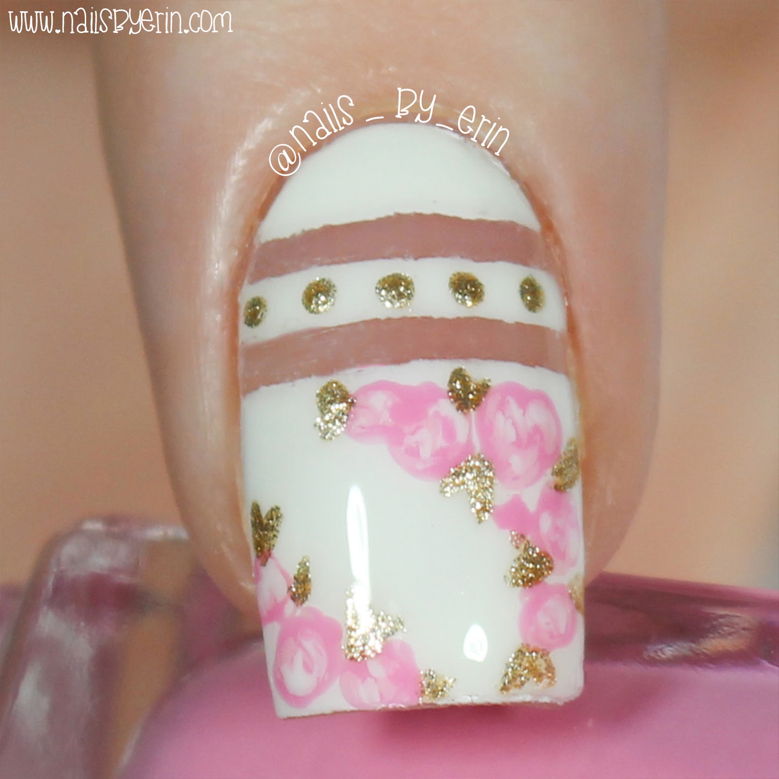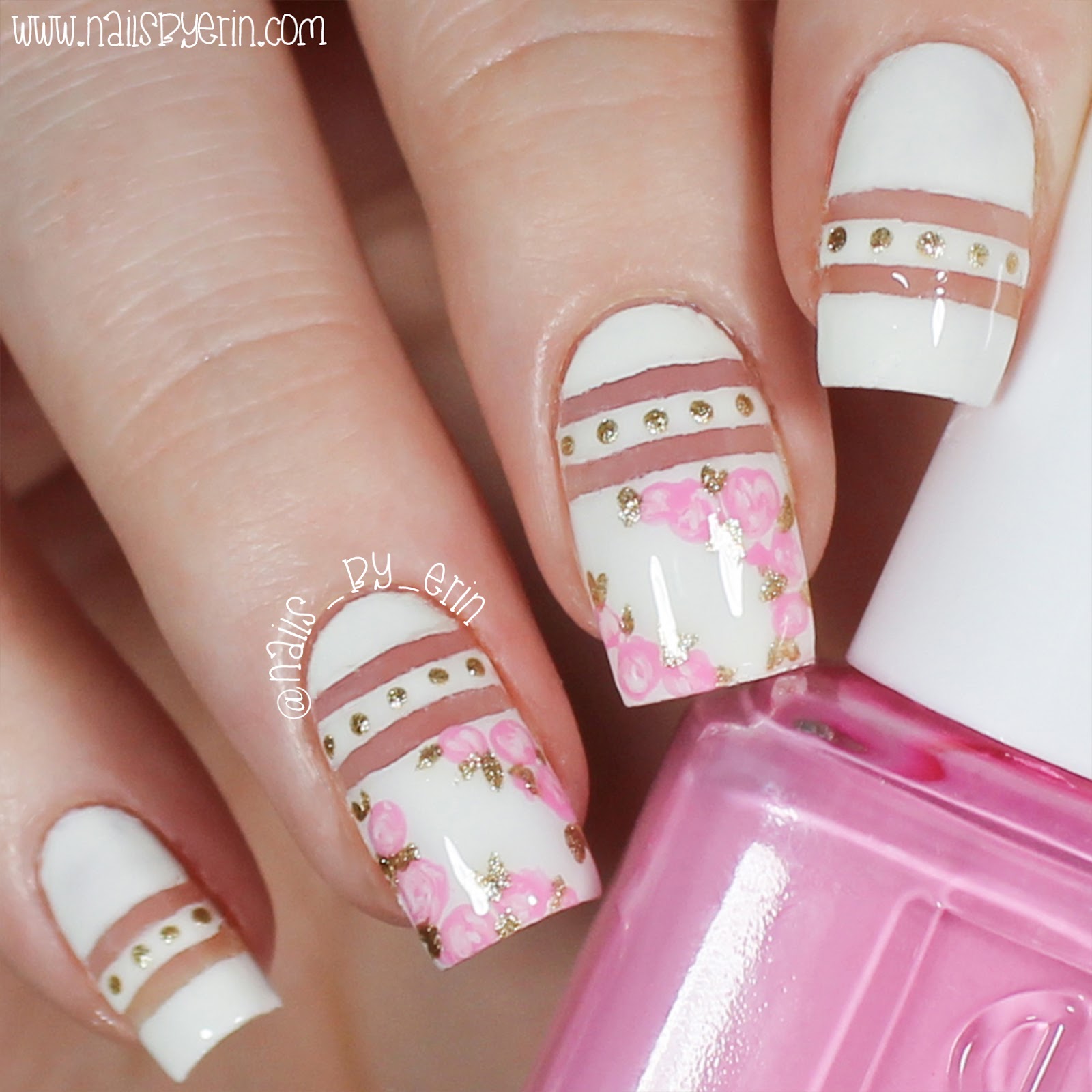 I basically started by putting two small straight nail vinyls on each nail (I get all my nail vinyls from Snail Vinyls, and you can use my code NAILSBYERIN for 15% off!). Then I painted over with a white nail polish. I put the stripes near the top of my nail on my ring and middle fingers, and I put the stripes lower on all my other nails. I added some small gold dots as an accent, as well as some pink flowers on my ring and middle nails. To keep with the theme of gold accents, I painted the leaves of the flowers in gold.