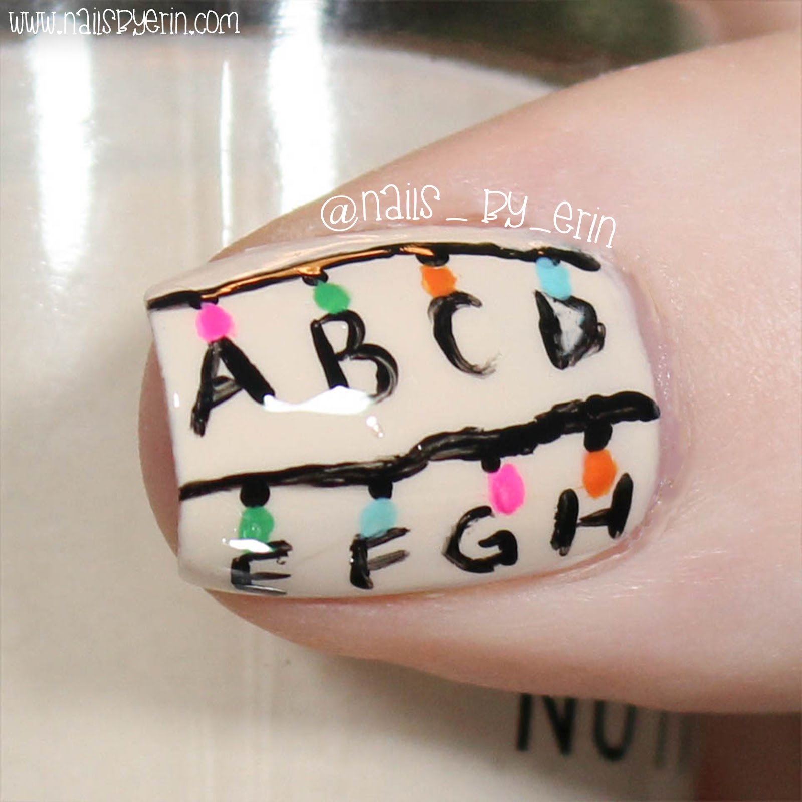 And on my thumb I decided to recreate the alphabet wall that Joyce Byers made in her living room. Luckily the letters she painted were pretty messy, which made it a lot easier to put them on my nail! The letters didn’t have to be perfect, and the Christmas lights were pretty easy, too.