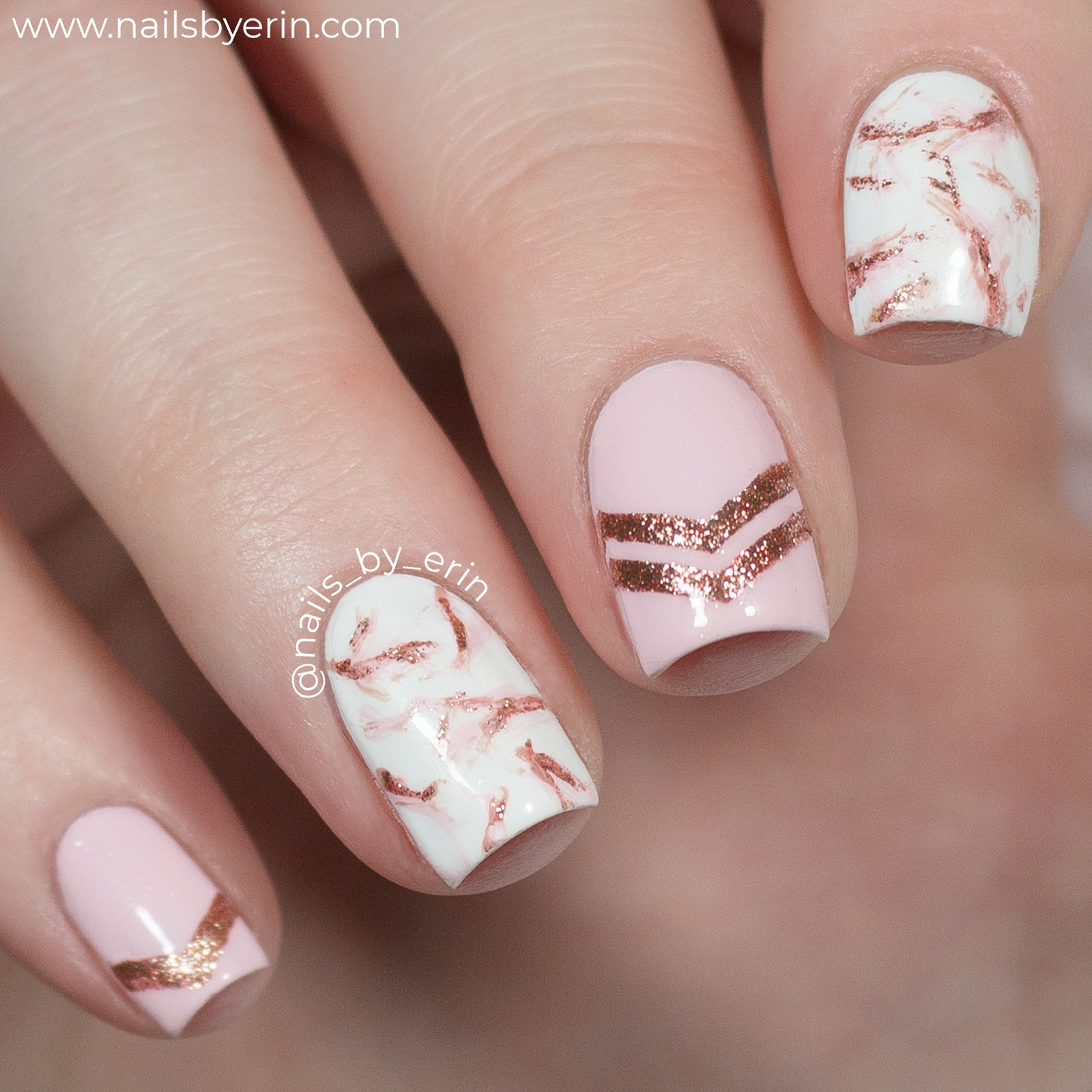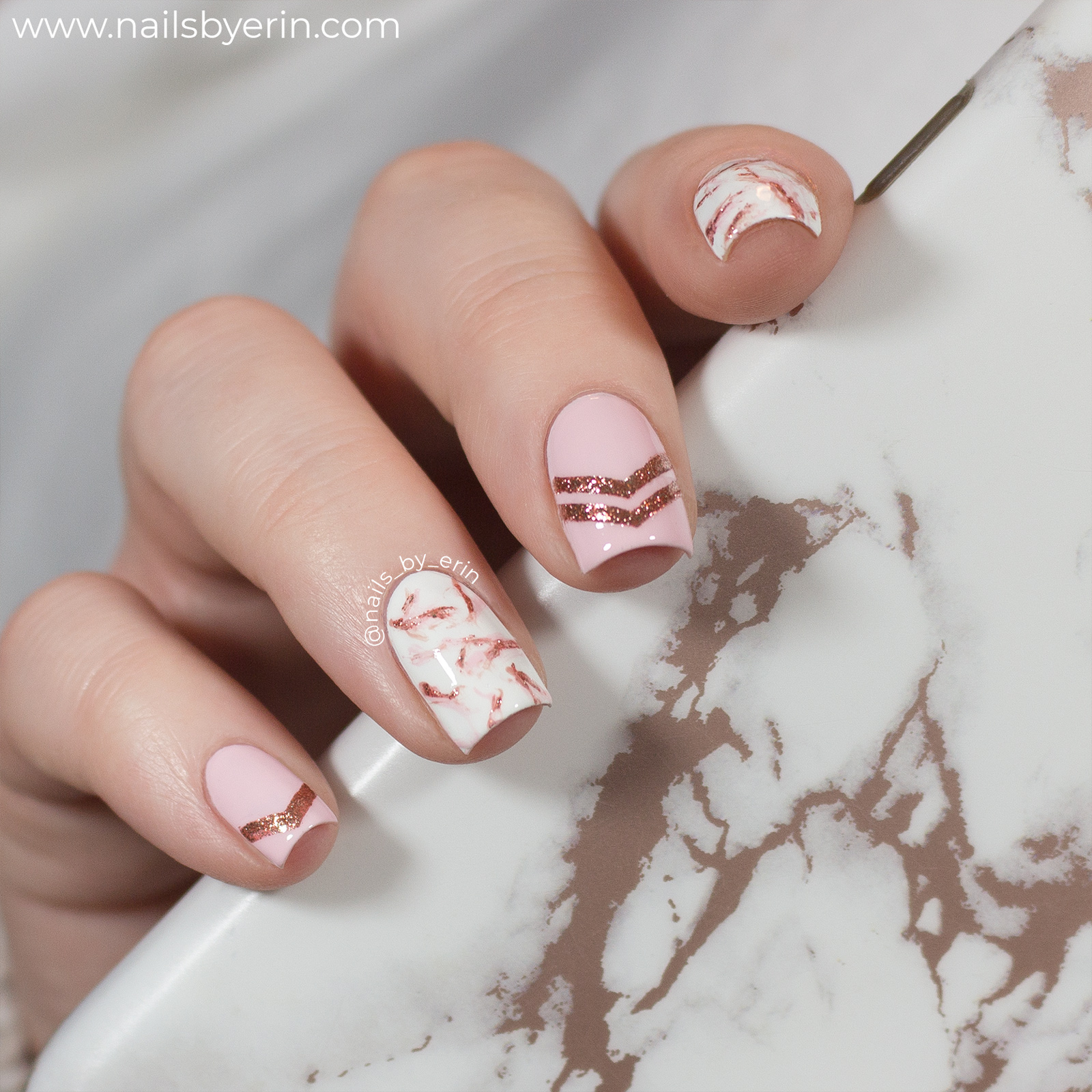 This nail art is summing up a few of my favorite styles right now…. Rose gold, marble, and geometric patterns! If I didn’t hate my marble pattern so much, I think I would really love this design lol.