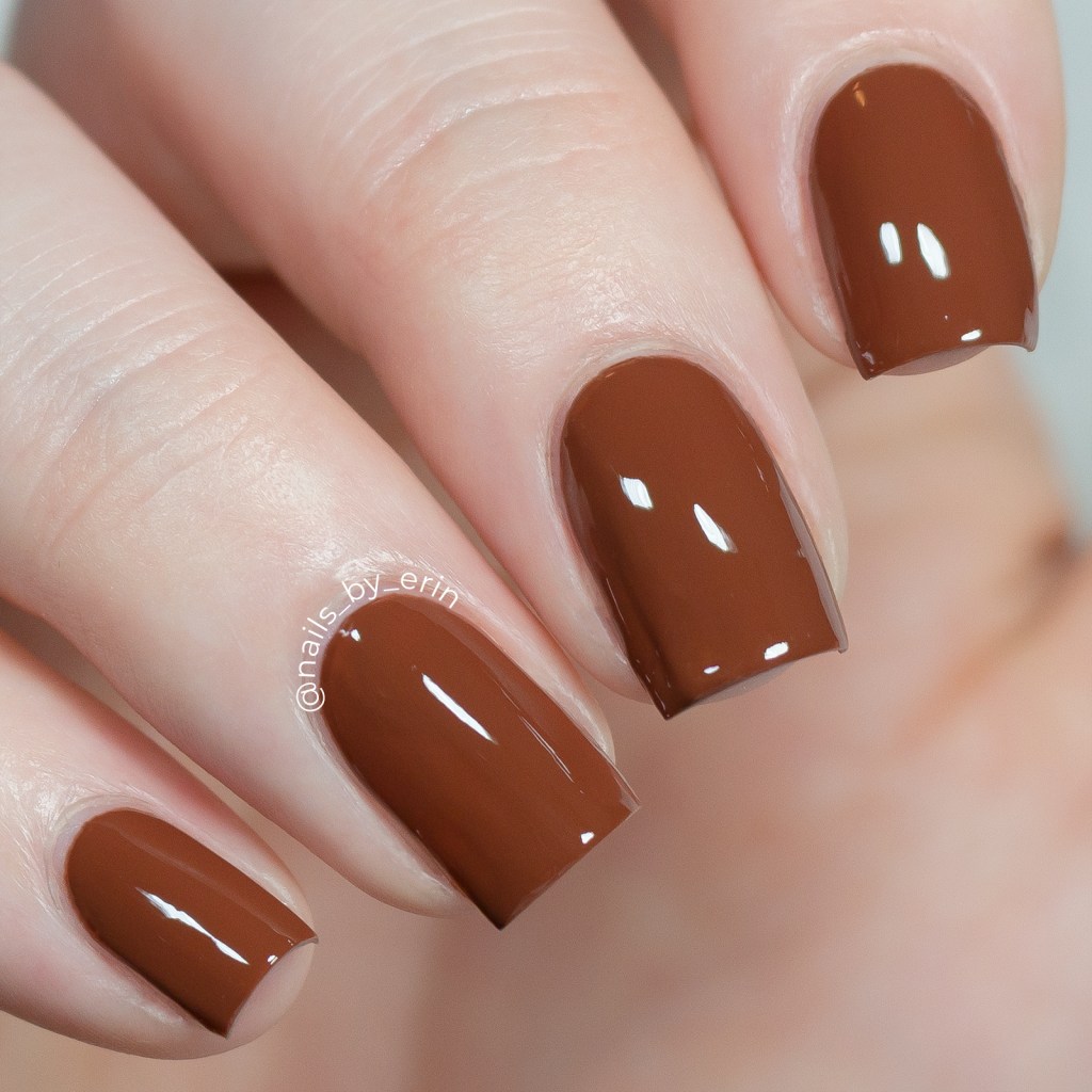 This next one is Canyon Clay, a burnt umber, warm brown creme. Again, wearing 2 smooth, creamy coats with Orly Glosser Top Coat. I’m not sure if it was my error or because something was different about the formula on this one, but for some reason this polish seemed a little thinner than the others and it was easier to flood my cuticles. Coverage was still perfect and opaque in 2 coats, and again it’s very shiny on its own.